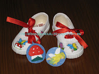 Y aquí podéis ver las zapatillas de niña con el hada Lulú y las de niño con el duende Lulo. A juego con las zapatillas he hecho horquillas y coleteros para ellas, claro. Estas son para Alicia, y para Elisabeth. Unas niñas preciosas que van a estar monísimas con sus zapatillas de Lulú y coleteros a juego.